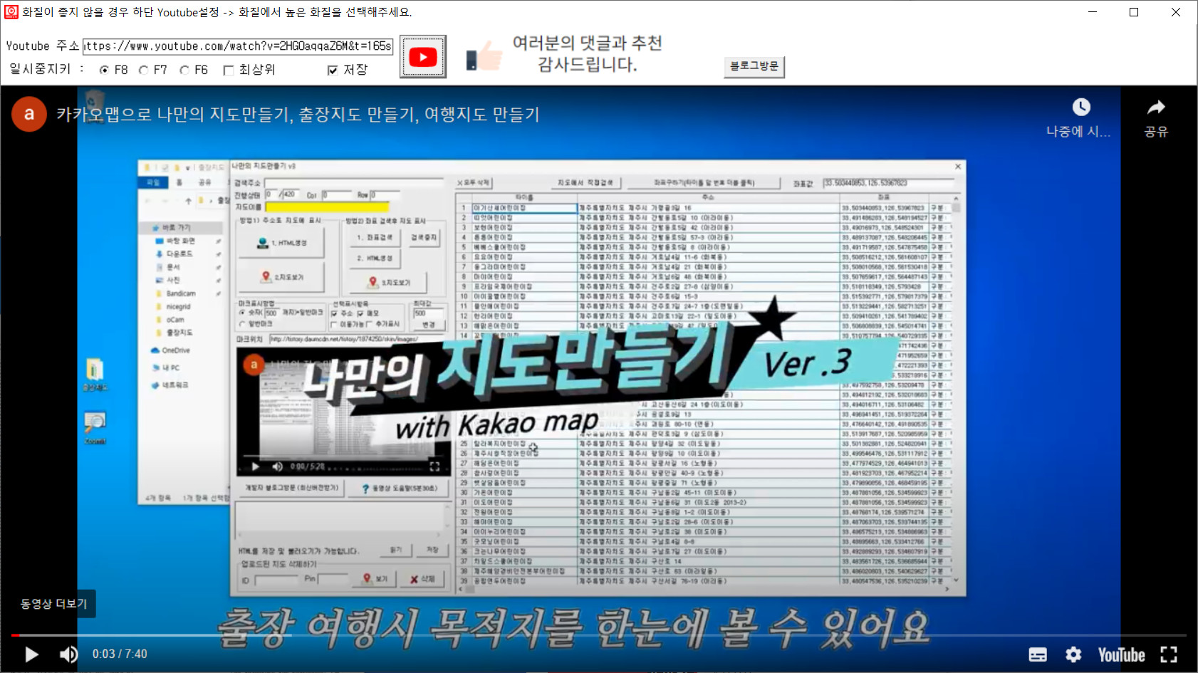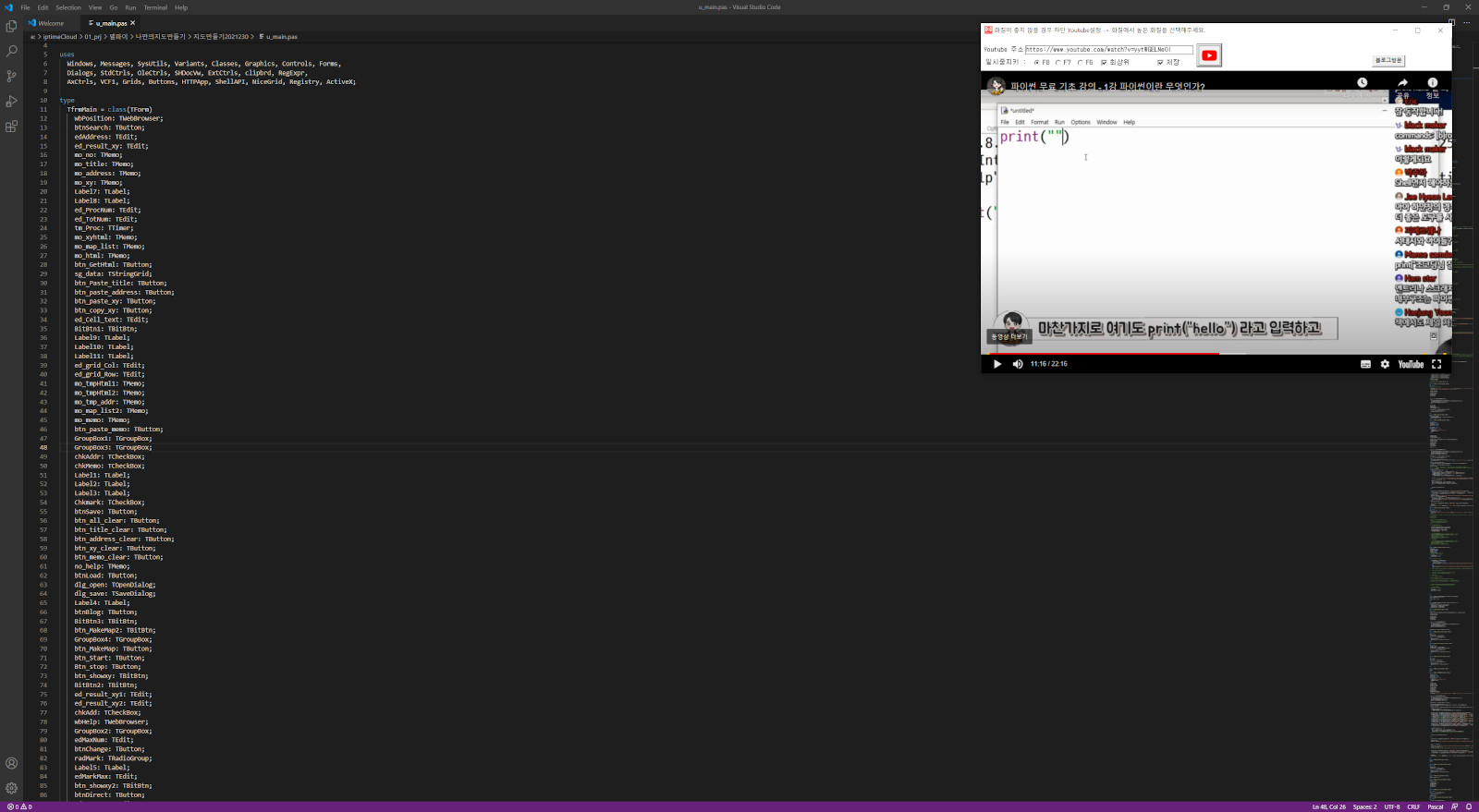 사이즈를 자유롭게 조절할 수 있습니다. 코딩 창에서도 단축키(F8, F7, F6)를 이용하면 일시중지, 재생이 가능합니다. 최상위를 지정하면 화면 최상단으로 올라가서 영상 보기에 편리합니다.